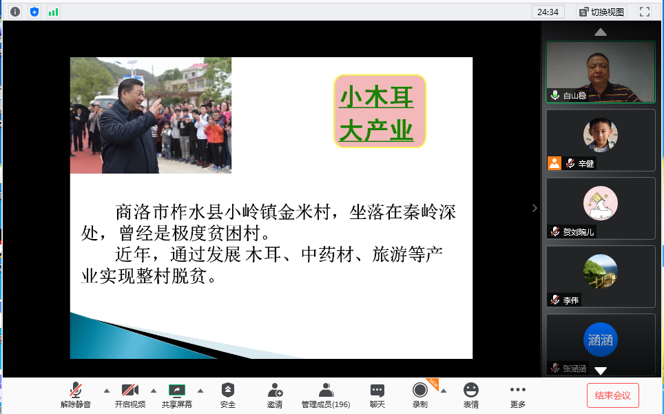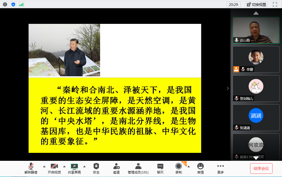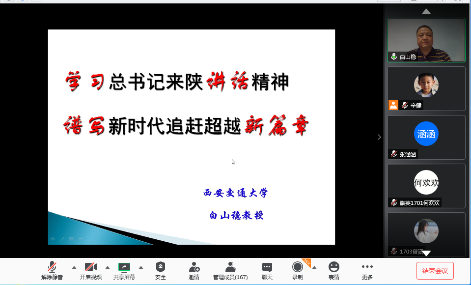 2020年7月7日上午9:30,西安交通大学特聘教授白山稳为威尼斯432888cam近200余名师生做了一场题为《研学习近平总书记来陕讲话精神,谱写新时代追赶超越新篇章》的讲座。本次讲座是威尼斯432888cam实践周系列活动之一,采用腾讯会议的方式在线上展开。会议由旅游管理教研室主任辛健老师主持。