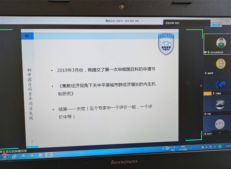 陈乐博士首先分享了自己对申报国自科失败的思考,指出申报过程中遇到的问题,总结了失败的原因,认为研究主题的表述新意不足,并且撰写借鉴的模板不太合适。紧接着他指出,自己在申报教育部项目的议题,是跟潘秋玲教授多次讨论后明确的长期研究方向,并在与李九全及孙鹏教授两人交流的过程中得到进一步改进和提升,最终形成申报议题。最后,陈博士还向各位老师介绍了自己的研究方向、研究技能以及未来可能和各位老师进行科研合作的选题领域。