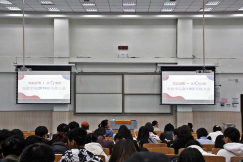 2021年3月3日晚,威尼斯432888cam在SD307教室举行2019级本科生“笃实进取,从心出发”为主题的年级大会,大会由学生代表王子琪主持。班主任王鹏涛老师,2019级辅导员胡森文老师及2019级全体本科生参会。